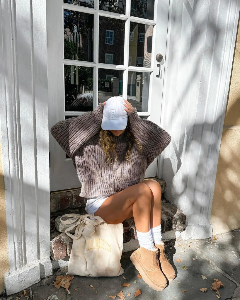 A chunky sweater with shorts and UGG adds a stylish yet laid-back vibe. The addition of a white baseball cap and tote bag makes it a perfect outfit for a sunny fall day.