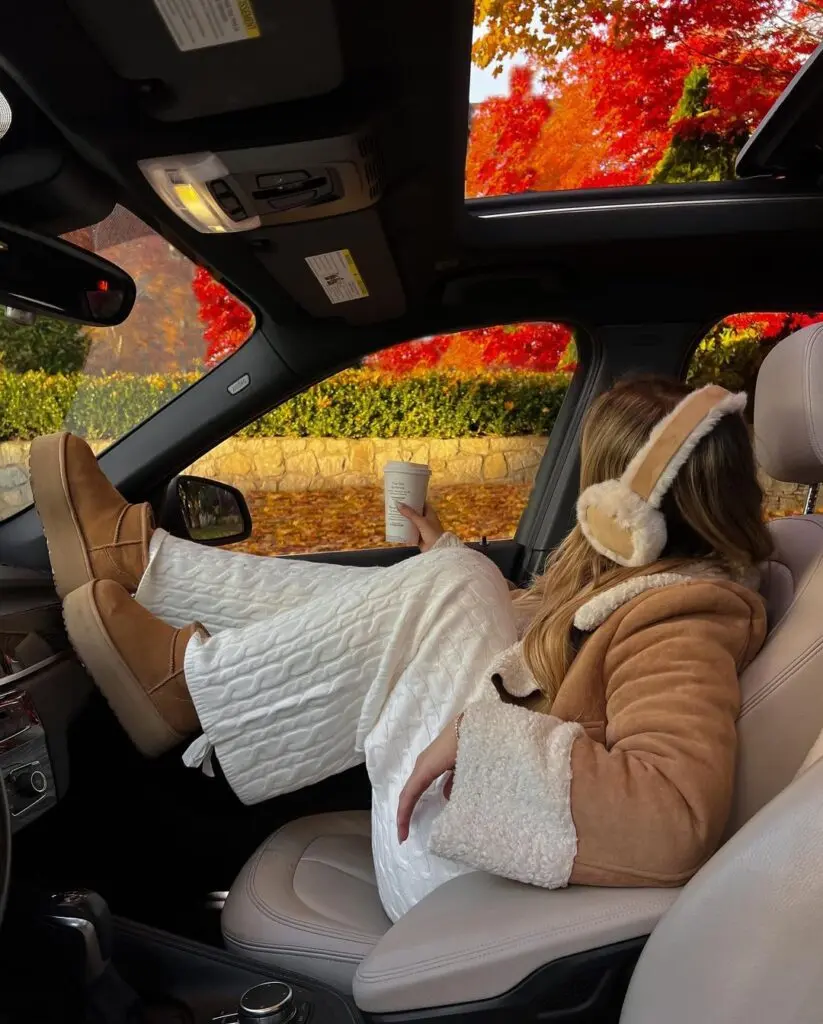Settle into fall vibes with a warm shearling coat, matching earmuffs, and comfy UGGs. This look is all about cozy road trip comfort, with the perfect pairing of cream and caramel tones blending effortlessly with the changing autumn leaves.