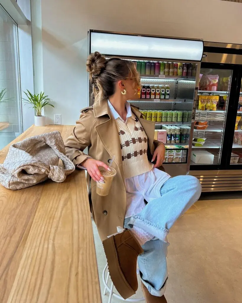 A trench coat and argyle sweater vest over a crisp button-down bring an air of sophistication to this casual look, finished off with soft jeans and the classic UGG slipper. Perfect for coffee shop lounging while staying stylish and warm.