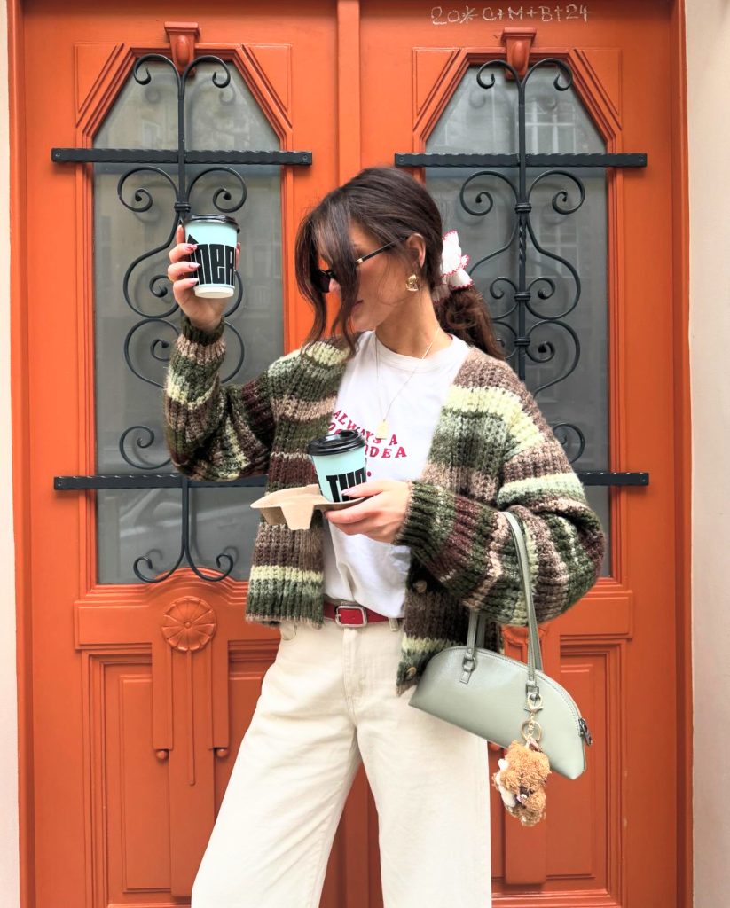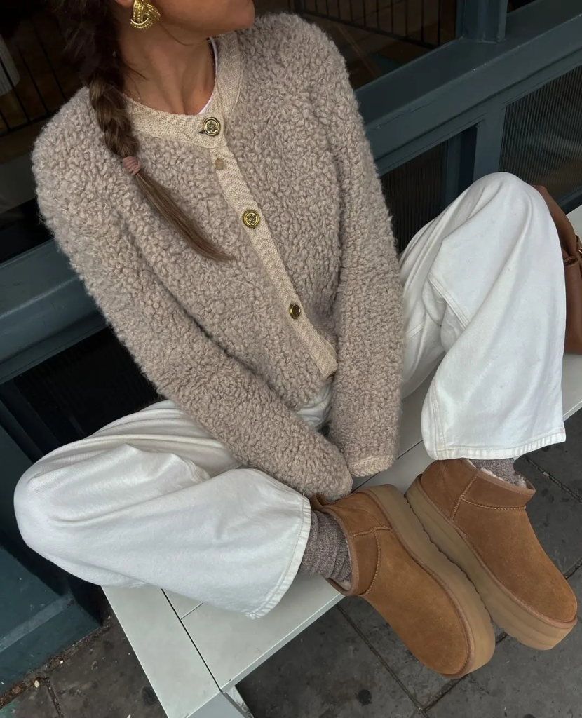 This cozy knit cardigan paired with white wide-leg pants and the iconic UGG slipper creates an effortless yet chic look. The chunky knit texture adds warmth, while the neutral tones are perfect for a laid-back yet stylish day out.