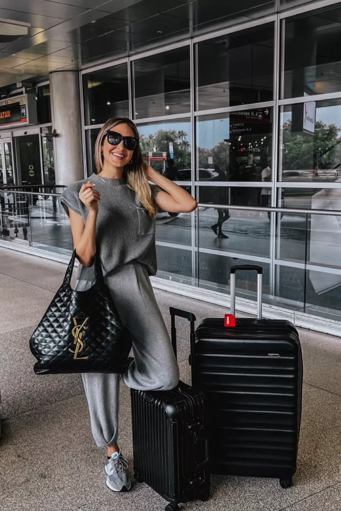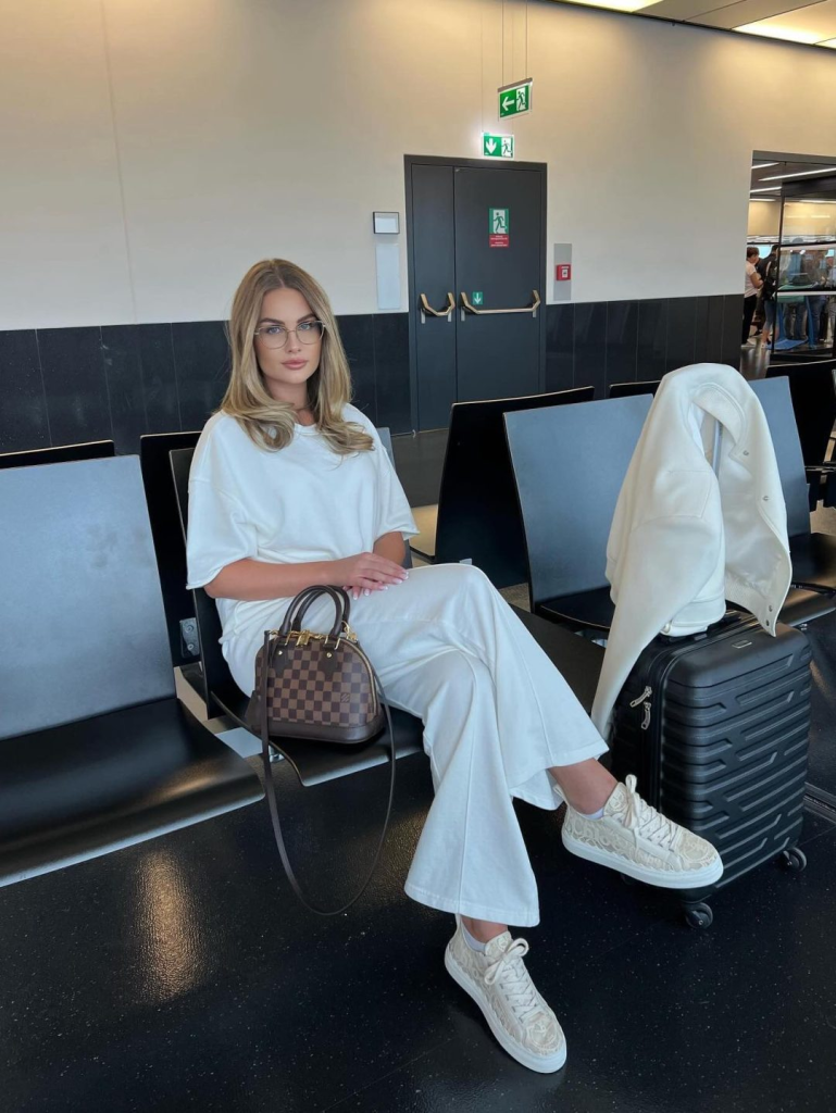 For a clean and minimal travel aesthetic, this all-white ensemble is a winner. The wide-leg pants and oversized tee create a comfortable yet polished vibe. Paired with white sneakers and a Louis Vuitton mini bag, this outfit is perfect for the traveler who likes to keep it simple but stylish.