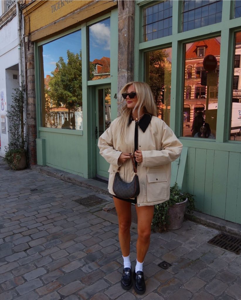 Who said comfort can’t be stylish? This look blends laid-back vibes with a chic twist, featuring a cozy cream jacket, matching shorts, and classic chestnut UGG boots. Perfect for grabbing your favorite coffee on a crisp day, the whole outfit feels effortlessly put together yet snug enough to keep you comfy all day. Wouldn’t this be a go-to look for a relaxed weekend?