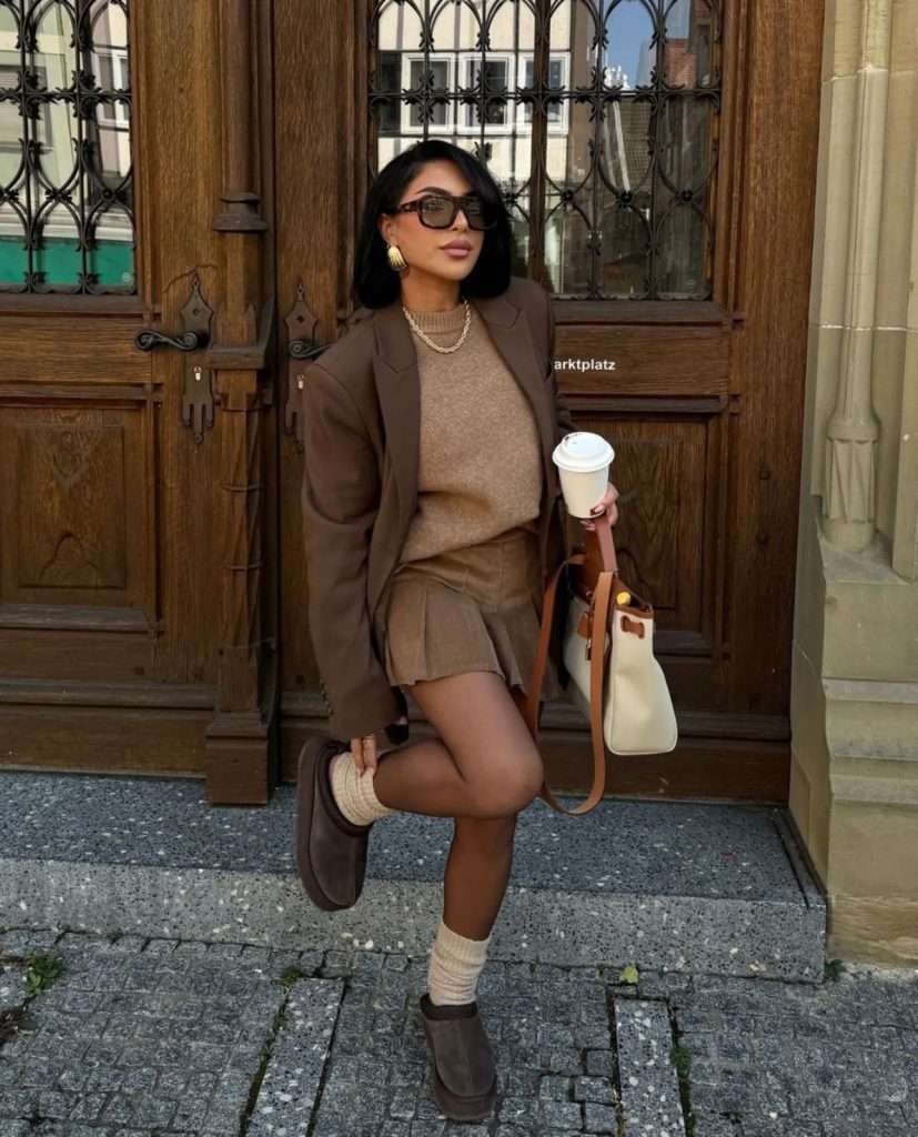 This look blends fall vibes with a chic twist, pairing a cream cozy sweater and brown mini skirt. The tan UGGs complete the look, adding both warmth and laid-back style.