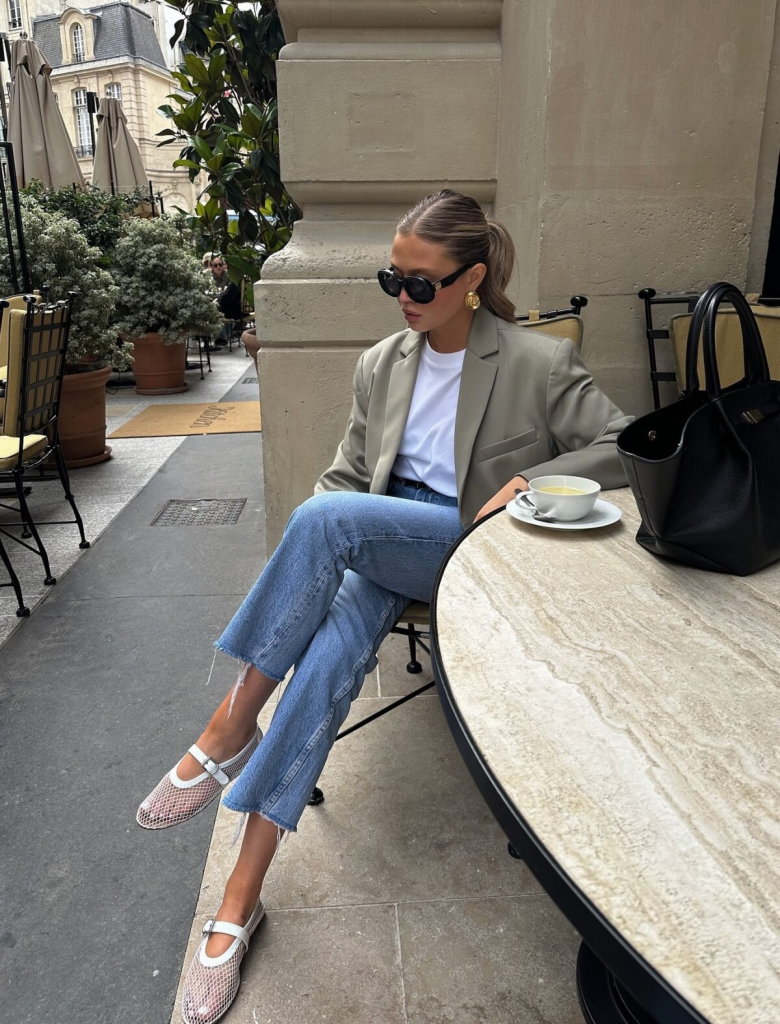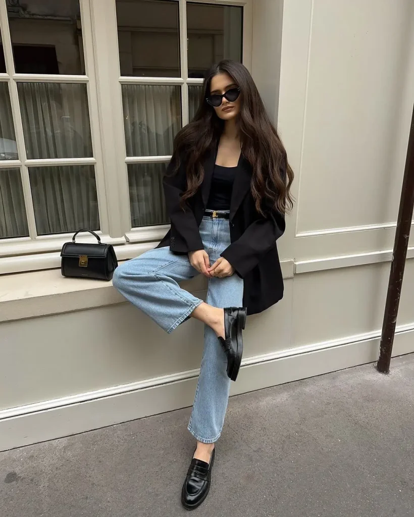 A Parisian café moment, this outfit is all about effortless elegance. A crisp white tee tucked into straight-leg blue jeans is elevated with a cropped black leather jacket and sleek pointed-toe boots. The structured mini handbag and oversized sunglasses add an extra dose of sophistication, making this the perfect brunch or coffee-date look.