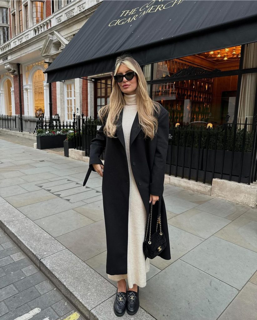 This outfit is the perfect mix of edgy and feminine—a soft, taupe ribbed knit midi dress paired with a structured black leather biker jacket. The chunky platform boots and sleek black handbag add a modern, street-style edge. Ideal for cool-weather city strolls or a casual day out while staying effortlessly stylish.