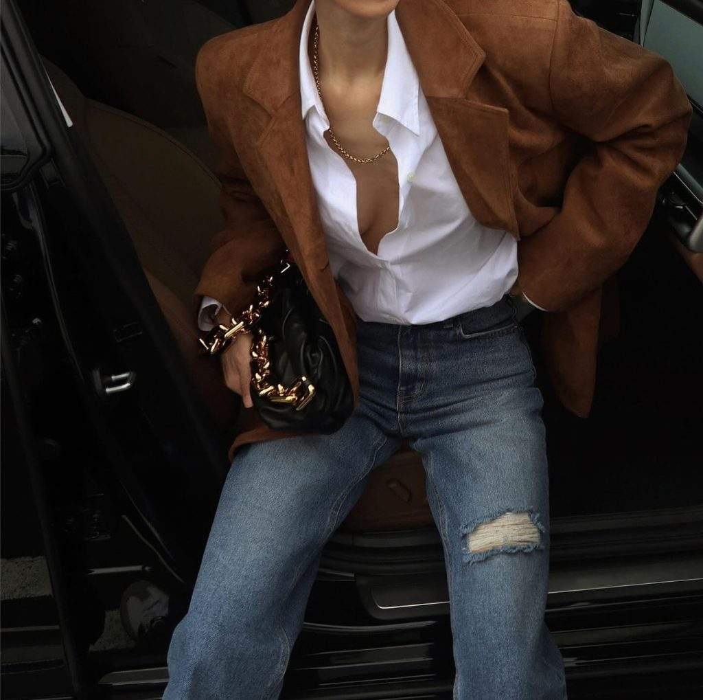 A summer-meets-fall vibe, this outfit mixes a crisp white crop top with vintage-style denim shorts, topped with an oversized leather blazer. The black ankle boots and sleek sunglasses elevate the casual base, making it the perfect brunch-to-happy hour outfit.